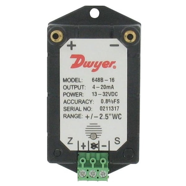 Differential Transmitter, Output 4 to 20mA DC, Minimum Pressure 0 in wc, Maximum Pressure 10 in wc, Overpressure 20 psi, Accuracy +/-1.00 Percent of Full Scale, Number of Wires 2, Process Connection Gender Female, Process Connection Size 1/8 in, Process Connection Type Threaded, Power Required 18 to 30V DC, IP Rating IP56, NEMA Rating NEMA 4, Series 647, Housing Material Steel, Electrical Connections Screw Terminals, Burst Pressure Not Applicable