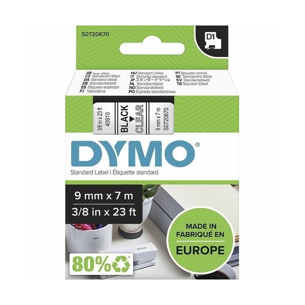 Dymo Label Tape,f/DYMO Labelmakers,3/8''x23',Black/Clear CARTRIDGE,TAPE,3/8'',BLACK/CLEAR