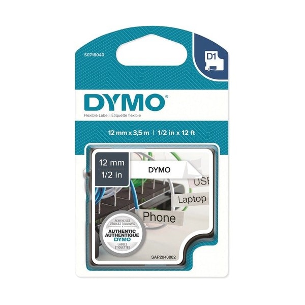 Dymo Label Tape, Nylon, Black Print, 1/2''x12', WE CARTRIDGE,TAPE,1/2'',FLEXNYLON,BLACK/WHITE