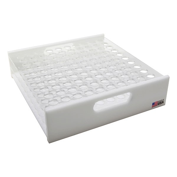 Item Tube Rack, Number of Compartments 100, Autoclavable No, Material Acrylic, Clear/White, Height 9 1/2 in, Length 2 1/2 in, Width 9 1/2 in, Format 10x10, For Use With -, Standards -, Includes Hand Grips