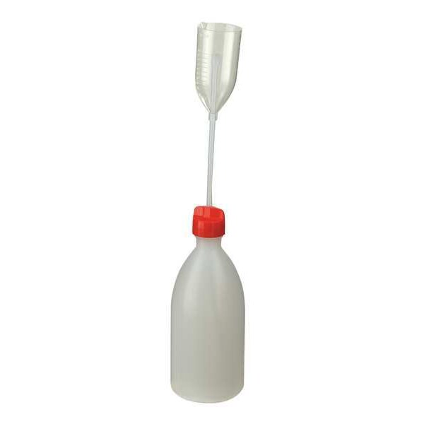 Dispensing Bottle, Body Color Clear, Body Material LDPE, Body Diameter - Metric 75 mm, Capacity - Metric 500 mL, Capacity - English 16.9 fl oz, Overall Height - Metric 340 mm, Clarity Translucent, Closure Included Yes, Closure Color Red, Mouth Size Narrow, Autoclavable No, Graduated Yes, Sterile/Non-Sterile Non-Sterile, Pre-Cleaned None, Graduation Increments - Metric 1 mL, Special Features LDPE Adjustable Volume Bottles with a PMP Dispenser Cup, Suitable for Foodstuff, Shape Round