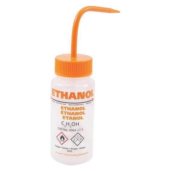 Wash Bottle, Capacity - Metric 250 mL, Imprinting Ethanol, Capacity - English 8.45 fl oz, Basic Material Plastic, Body Material LDPE, Vented/Nonvented Vented, Closure Material Polypropylene, Spout Style Standard Spout, Product Type Wash Bottle, Body Color Clear, Body Diameter 60 mm, Closure Color Orange, Autoclavable No, Closure Included Yes, Mouth Size Wide, Clarity Transparent, Closure Style Screw On, Numbers of Bottles Included 5, Standards NFPA, Package Quantity 5