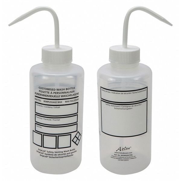 Wash Bottle, Capacity - Metric 1 L, Imprinting Write-On, Capacity - English 33.81 fl oz, Basic Material Plastic, Body Material LDPE, Vented/Nonvented Vented, Closure Material Polypropylene, Spout Style Standard Spout, Product Type Wash Bottle, Body Color Natural, Body Diameter 90 mm, Closure Color White, Autoclavable No, Closure Included Yes, Mouth Size Wide, Clarity Transparent, Closure Style Screw On, Numbers of Bottles Included 5, Standards NFPA, Package Quantity 5