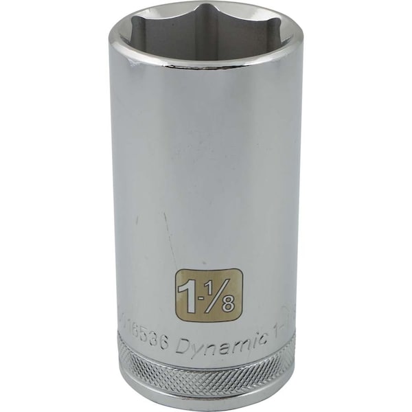 Size: 1-1/8". Drive Type: 6 Point. 1/2" Drive. Chrome finish for maximum resistance against corrosion. Large laser etched markings improve size identification and provide differentiation between SAE and metric sizes. Knurled ring provides superior grip for quicker and easier removal of socket from ratchets and attachments. Brand, part number and size also hard stamped. Meets ANSI standards.