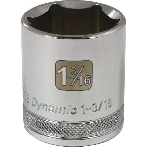 Size: 1-3/16". Drive Type: 6 Point. 1/2" Drive. Chrome finish for maximum resistance against corrosion. Large laser etched markings improve size identification and provide differentiation between SAE and metric sizes. Knurled ring provides superior grip for quicker and easier removal of socket from ratchets and attachments. Brand, part number and size also hard stamped. Meets ANSI standards.