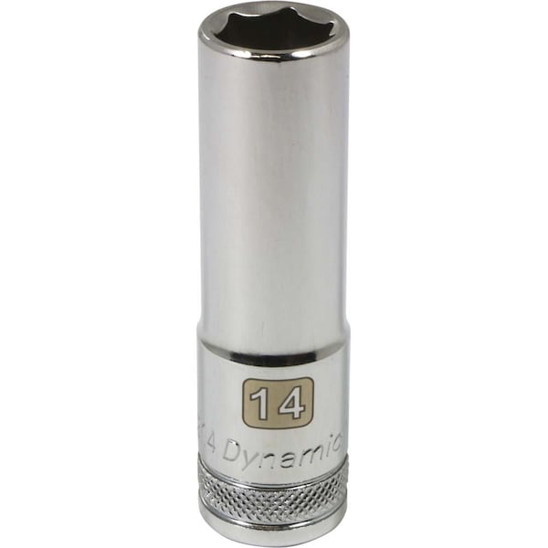 Size: 14mm. Drive Type: 6 Point. 1/2" Drive. Chrome finish for maximum resistance against corrosion. Large laser etched markings improve size identification and provide differentiation between SAE and metric sizes. Knurled ring provides superior grip for quicker and easier removal of socket from ratchets and attachments. Brand, part number and size also hard stamped. Meets ANSI standards.