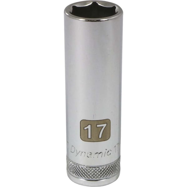 Size: 17mm. Drive Type: 6 Point. 1/2" Drive. Chrome finish for maximum resistance against corrosion. Large laser etched markings improve size identification and provide differentiation between SAE and metric sizes. Knurled ring provides superior grip for quicker and easier removal of socket from ratchets and attachments. Brand, part number and size also hard stamped. Meets ANSI standards.