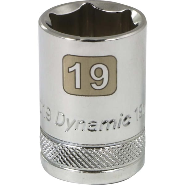 Size: 19mm. Drive Type: 6 Point. 1/2" Drive. Chrome finish for maximum resistance against corrosion. Large laser etched markings improve size identification and provide differentiation between SAE and metric sizes. Knurled ring provides superior grip for quicker and easier removal of socket from ratchets and attachments. Brand, part number and size also hard stamped. Meets ANSI standards.