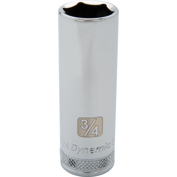Size: 3/4". Drive Type: 6 Point. 1/2" Drive. Chrome finish for maximum resistance against corrosion. Large laser etched markings improve size identification and provide differentiation between SAE and metric sizes. Knurled ring provides superior grip for quicker and easier removal of socket from ratchets and attachments. Brand, part number and size also hard stamped. Meets ANSI standards.