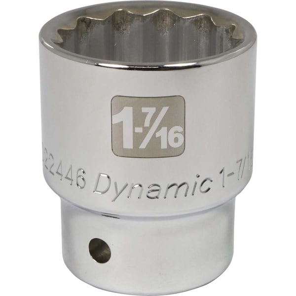 Size: 1-7/16". Drive Type: 12 Point. 3/4" Drive. Chrome finish for maximum resistance against corrosion. Large laser etched markings improve size identification and provide differentiation between SAE and metric sizes. Knurled ring provides superior grip for quicker and easier removal of socket from ratchets and attachments. Brand, part number and size also hard stamped. Meets ANSI standards.
