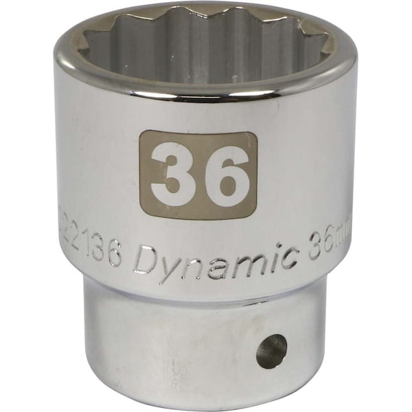 Size: 36mm. Drive Type: 12 Point. 3/4" Drive. Chrome finish for maximum resistance against corrosion. Large laser etched markings improve size identification and provide differentiation between SAE and metric sizes. Knurled ring provides superior grip for quicker and easier removal of socket from ratchets and attachments. Brand, part number and size also hard stamped. Meets ANSI standards.