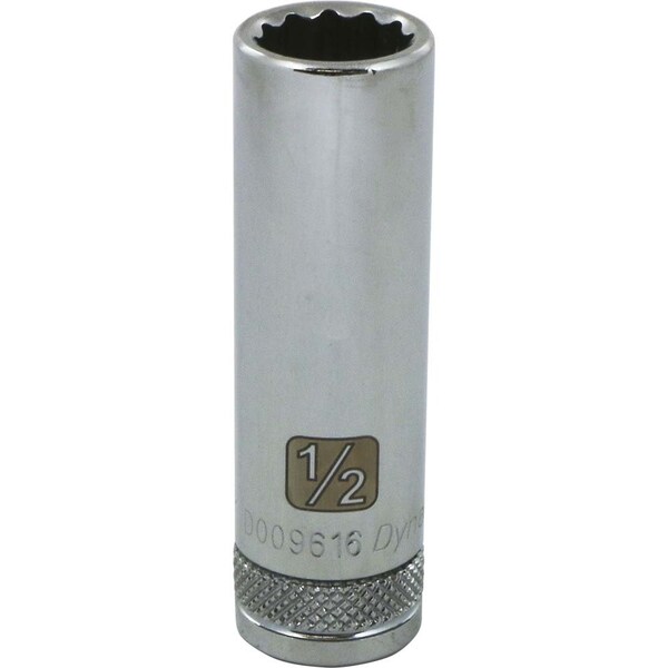 Size: 1/2". Drive Type: 12 Point. 3/8" Drive. Chrome finish for maximum resistance against corrosion. Large laser etched markings improve size identification and provide differentiation between SAE and metric sizes. Knurled ring provides superior grip for quicker and easier removal of socket from ratchets and attachments. Brand, part number and size also hard stamped. Meets ANSI standards.