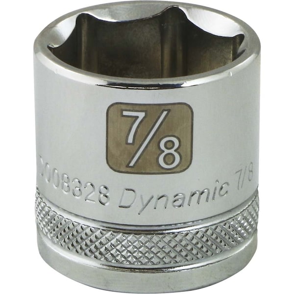 Size: 7/8". Drive Type: 6 Point. 3/8" Drive. Chrome finish for maximum resistance against corrosion. Large laser etched markings improve size identification and provide differentiation between SAE and metric sizes. Knurled ring provides superior grip for quicker and easier removal of socket from ratchets and attachments. Brand, part number and size also hard stamped. Meets ANSI standards.