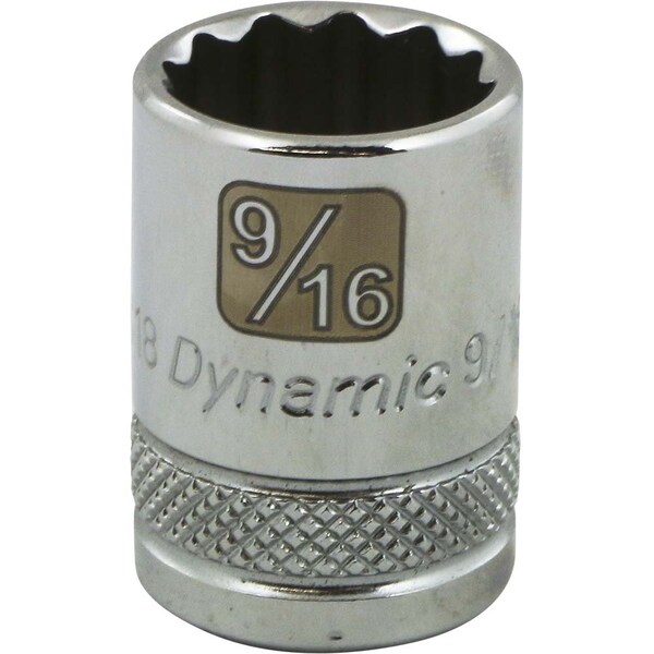 Size: 9/16". Drive Type: 12 Point. 3/8" Drive. Chrome finish for maximum resistance against corrosion. Large laser etched markings improve size identification and provide differentiation between SAE and metric sizes. Knurled ring provides superior grip for quicker and easier removal of socket from ratchets and attachments. Brand, part number and size also hard stamped. Meets ANSI standards.