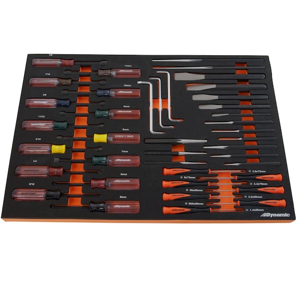 Set Includes: Pin Punches: 1/8, 3/16, 1/4. Drift Punches: 3/16, 1/4. Solid Punches: 1/8, 3/16, 1/4. Centre Punches: 1/8, 5/32, 1/4. Cold Chisels: 5/16, 1/2, 5/8, 3/4, 7/8. Nut Drivers SAE: 3/16, 1/4, 5/16, 11/32, 3/8, 7/16, 1/2. Nut Drivers Metric: 5, 6, 7, 8, 9, 10, 11 mm. Offset Phillips®: #1, 2. Offset Slotted: 3/16 x 1/4. Offset Square Recess: #1, 2. Slotted Precision Screwdrivers: 1.4, 2, 2.4, 3. Phillips® Precision Screwdrivers: #000, 00, 0. Foam Tray Organizer: 21-7/8 (w) x 15 (d) x 1-1/4 (h). Meets ANSI standards