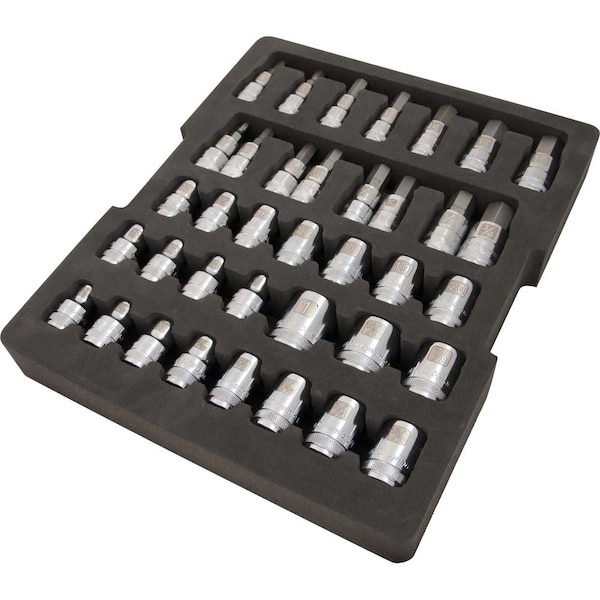 Set Includes: 6 Pt. SAE Sockets: (3/8"-1"); Metric Sockets: (10-20 mm); SAE Hex Sockets: (1/4"-3/4"); Metric Hex Sockets: (6-19 mm); foam tray organizer. Foam insert, precisely created using CNC routers, provide a tight fit for each tool in the set, keeping them neatly organized. Each tool slot is marked making tool identification quick and easy. All foam inserts are made using 3D design and two layers of high-density foam in contrasting colours (black and orange). The orange color acts as a visual indicator so you can spot missing tools quickly. Tray measures 11.2" (L)" X 1.5" (H)" X 13.2" (W) and fits in most standard size toolbox drawers. Meets ANSI standards