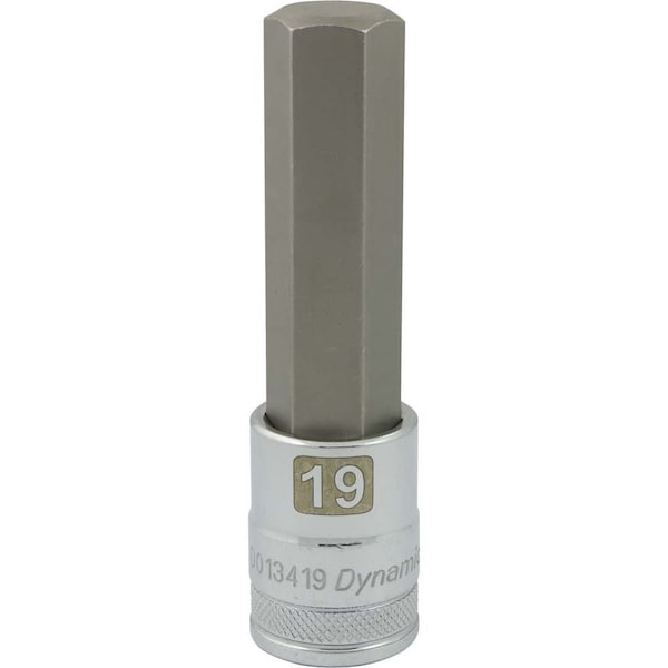 The Dynamic D013419 Tools 1/2" Drive Metric Hex Head, 19mm Long Bit, Chrome Finish is a quality bit socket. It measures 2.44". The 19mm hex head features a chrome finish for maximum resistance against corrosion and laser etched markings that improve size identification and differentiation between SAE and metric sizes. Meets ANSI standards. This Dynamic D013419 Tools 1/2" Drive Metric Hex Head, 19mm Long Bit, Chrome Finish will not let you down on the job.