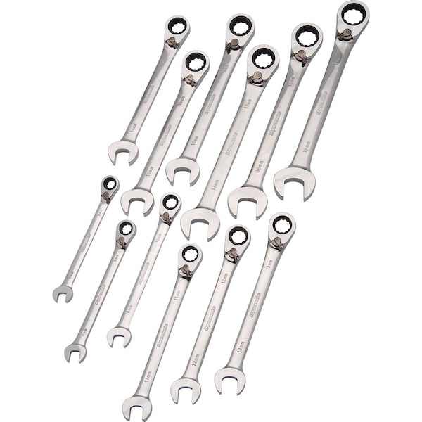 Contains: 8, 9, 10, 11, 12, 13, 14, 15, 16, 17, 18, 19mm. Drive Type: 12 Point. Large ratchet lever allows for quick and easily direction changes. Chrome finish for maximum resistance against corrosion. 15° angled open and 15° offset boxed end. Meets ANSI standards. Packaged in: Plastic tray.
