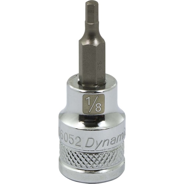 Size: 1/8". Bit length (inches): 0.87. Chrome finish for maximum resistance against corrosion. Laser etched markings improve size identification and provide differentiation between SAE and metric sizes. Brand, part number and size also hard stamped. Knurled ring provides superior grip for quicker and easier removal of socket from ratchets and attachments. Meets ANSI standards.