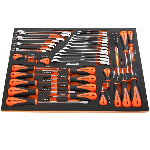 Set Includes: Slotted Screwdrivers: 5/32, 3/16, 1/4, 5/16, 3/8. Slotted Stubby Screwdriver: 1/4. Phillips® Screwdrivers: #0, 1, 2, 3. Phillips® Stubby Screwdriver: #2. Square Recess Screwdrivers: #0, 1, 2, 3. Stubby Square Recess Screwdrivers: #1, 2. Magnetic Bit Holder Comfort Handle. 14 Piece Screwdriver Bit Set. Circuit Tester. Reversible Ratcheting Wrenches SAE: 5/16, 3/8, 7/16, 1/2 ,9/16, 5/8, 11/16, 3/4. Reversible Ratcheting Wrenches Metric: 8, 9, 10, 11, 12, 13, 14, 15, 16, 17, 18, 19 mm. Foam Tray Organizer: 21-7/8 (w) x 15 (d) x 1-1/4 (h). Meets ANSI standards