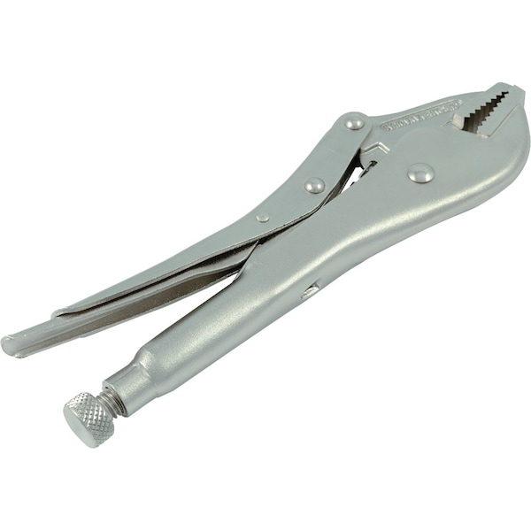 Size: 7". Unique release lever design prevents painful accidental pinching of hands and fingers. Nickel plated finish for corrosion resistance. Unique release lever design eliminates painful accidental hand pinch. Straight jaws provide firm grip on all flat shapes. Adjustable thumbscrew quickly sets the jaw capacity for a wide variety of applications.
