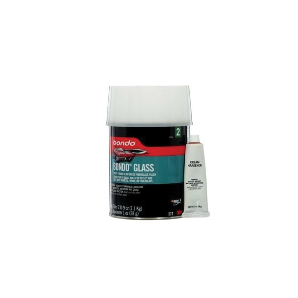 Twice as strong as regular body filler. Half-inch, interlocking fiberglass strands create strength and make Bondo Glass the ideal filler for repairing small dime size or smaller holes or rust-outs. The fiberglass strands in the filler allow you to cover holes and eliminate the need for backing strips, fiberglass mat, or cloth. Make repairing small holes easy with Bondo Glass. Covers small holes without the need for backing strips, cloth or matGreat for use on fiberglass, wood, metal, aluminum, SMC, and masonry and compatible with all paints systemsReinforced Body FillerSands in only 20 minutesWaterproofWorks great on boatsIncludes cream hardener