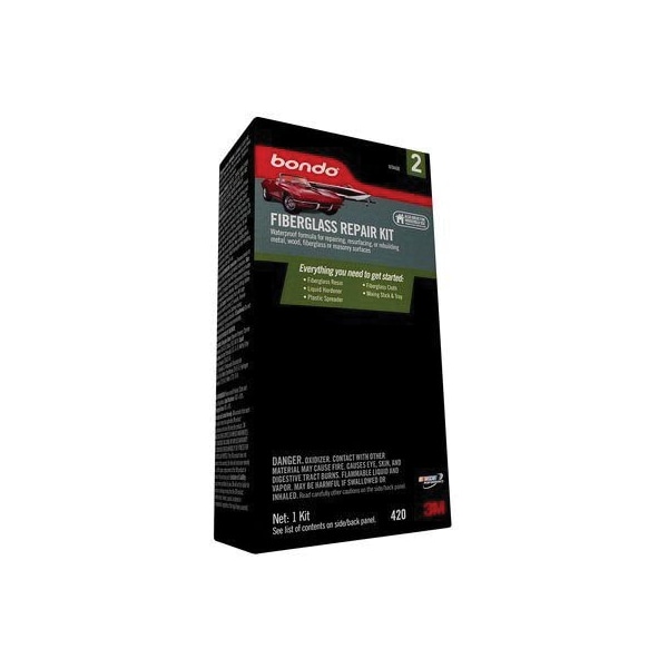 Bondo Fiberglass Repair Kit is a do-it-yourself solution for easy and effective auto body repair. Users can repair cracked, broken or rusted automobile body components quickly, easily and at a fraction of the cost versus part or panel replacement. The kit includes resin and hardener for a permanent, 100% waterproof seal that hardens in as little as two hours and is compatible with any paint. Non-shrinking polyester resin bonds to metals and plastics Non-shrinking polyester resin bonds to metals and plastics Non-shrinking polyester resin bonds to metals and plasticsKit includes all materials for easy application Kit includes all materials for easy application Kit includes all materials for easy applicationHardens quickly for fast repairs Hardens quickly for fast repairs Hardens quickly for fast repairsIncludes directions for easy, trouble-free use Includes directions for easy, trouble-free use Includes directions for easy, trouble-free useDo-it-yourself auto body repair at a fraction of the time and cost Do-it-yourself auto body repair at a fraction of the time and cost Do-it-yourself auto body repair at a fraction of the time and cost