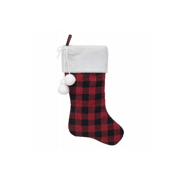 20 Red/Black Woven Plaid Stocking With White Velvet Cuff And Pom-Poms.