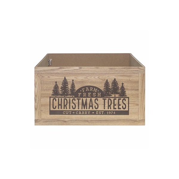 20 x 11 MDF Tree Stand Cover Christmas Trees Message. Crate Design Distressed Wood Veneer Finish. Hinges on 2 Opposing Corners Velcro on Edges of Other Opposing Corners.