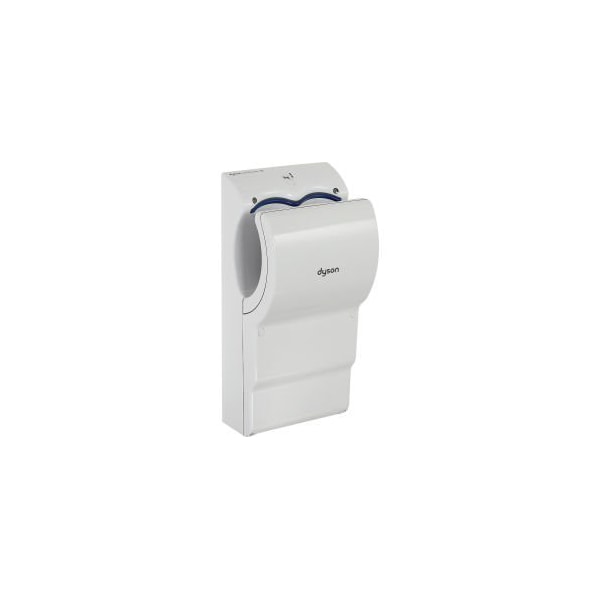THE DYSON AIRBLADE DB HAND DRYER IS 50% QUIETER WHEN COMPARED WITH THE ORIGINAL DYSON AIRBLADE HAND DRYER, BUT STILL TAKES JUST 12 SECONDS TO DRY HANDS. THE HAND DRYER AIR APERTURES ARE SCALLOP-SHAPED - THIS INCREASES THE DISTANCE THAT THE TWO SHEETS OF AIR TRAVEL BEFORE COLLIDING, WHICH REDUCES AIR RUSH NOISE. AN OFFSET FRONT APERTURE ALTERS THE ANGLE OF THE AIR, FURTHER REDUCING THE SOUND MADE WHEN THE SHEETS OF AIR COLLIDE. DYSON-DESIGNED HELMHOLTZ SILENCERS ABSORB THE UNPLEASANT TONAL FREQUENCIES GENERATED BY THE MOTOR, IMPROVING THE LEVEL AND QUALITY OF THE SOUND PRODUCED. SHEETS OF AIR TRAVELING UP TO 420 MPH SCRAPE WATER FROM THE FRONT AND BACK OF HANDS SIMULTANEOUSLY. A HEPA FILTER REMOVED 99.97% OF BACTERIA AT 0.3 MICRONS FROM THE AIR USED TO DRY HANDS. SMALL CARBON FOOTPRINT OFFERS SIGNIFICANTLY LOWER CARBON EMISSIONS THAN WARM AIR HAND DRYERS AND HAND TOWELS. APPROVED BY NSF INTERNATIONAL AND HACCP INTERNATIONAL. POLYCARBONATE/ABS CONSTRUCTION WITH WHITE COLOR FINISH.
