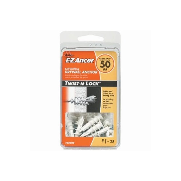 E-Z Ancor Twist-N-Lock 50 Drywall Anchors with Screws 25-Pack are great for hanging light fixtures, mirrors, clocks and picture frames in drywall. Install with only a #2 Philips screwdriver and #6 x 1-1/4 in. screws included. No pre-drilling required - screw directly into drywall. E-Z Ancor Twist-N-Lock 50 Drywall Anchors support 50 lbs. when installed in 1/2 in. drywall.Use for hanging or mounting objects in drywallUse in 1/2 in. or 5/8 in. drywall50 lbs. weight on package reflects maximum project load in 1/2 in. drywall50 lbs. weight capacity is for items hung flush to wall and may be less for those hung out from wall, like shelvingNo pre-drilling necessary - screw directly into drywallDo not overtighten anchorAudible click lets you know when the anchor is firmly setInstalls flush against the wall to prevent items from wobblingSplits and grips for a strong hold that won't back outMade with high-strength fiber-reinforced resin for superior durabilityCreates a small hole for easy installation, cleanup, and removalDo not use for ceiling applicationsDo not use for mounting televisions
