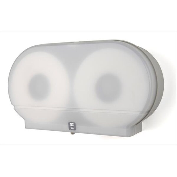 The Twin 9" Jumbo Roll Tissue with a 2-1/4" mandrel and the Translucent White cover and beige back, is universal for all brands of 9" Jumbo Roll Tissue with a 2-1/4" core. Unit also comes with a 3-3/8" adaptor. A sliding panel ensures the use of one roll at a time. The double-latch lock prevents theft and waste while the translucent cover enables easy detection of a low paper supply.