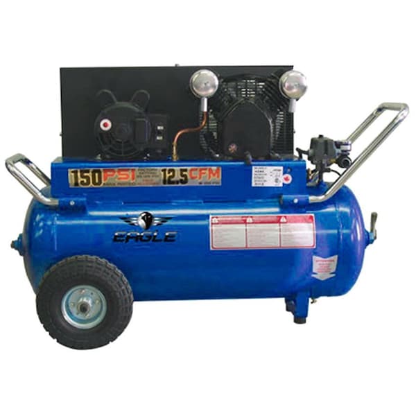 The Eagle 25 gallon portable compressor is perfect for the professional or the enthusiast. The large tank allows for longer runs times between the on/off intervals. The reliable 3.7hp motor drives the heavy duty V-twin cast iron pump and delivers an industy leading 12.5 CFM's of air with a max PSI of 150. The Eagle unit has an extended oil drain for easy clean service when it's time and convenient oil site glass for monitoring lubrcants. The Government certified ASME tank & pressure release valve ensures your safety as you work along beside the unit. The V-Style pump allows for the larger bore pistons to run at lower RPM rate while still producing more air than the competition. The lower speed, creates less friction and less heat ultimately givnig the compressor longer life. The fully enclosed metal belt guard meets or exceeds UL & OSHA requirements. Features like the automotive style air filters, dual quick connects, heavy duty ON/OFF pressure switch, and manual tank drain all add up to a greater value. The dual mode control feature is invaulable for contractors on sites with temporary power or where generators are being used. Dual control allows the unit to be operated in the traditional ON/OFF mode or the continous run mode which allows the unit to build max pressure then it unloads the extra air until the compressor drops to the kick in pressure again. This feature reduces stopping and starting and the continous run option eliminates the extra high amp draw that is assocaited with start up on air compressors. This Eagle model has proven to be a dependable unit at the top of it's class.