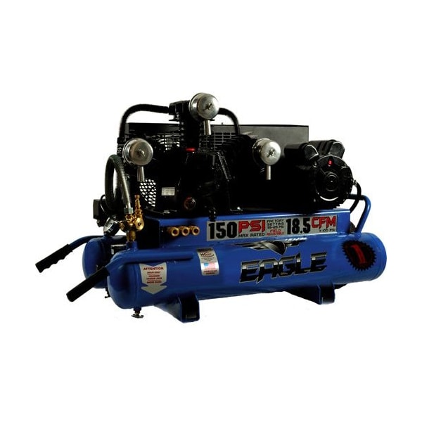 The Eagle wheelbarrow 5hp 220 volt compressor is paired with a cast iron V style three cylinder 150 psi pump that produces 18.5 CFM's of air. This portable unit is perfect for jobsites with limited power supply. It's dual mode STOP/START or CONTINUOUS run feature makes it ideal for temporary job site power or use with a generator. ThIs model loaded with convienent features like extended oil drain & automotive style air filters for easy service along with ready to use features like dual quick connects, a built in regulator and an industry leading 10 gallon tank.