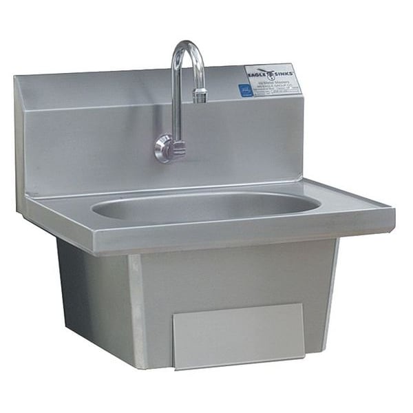 Handwashing Sink, Stainless Steel, Single Bowl, Back Splash 3-7/8 In., Mounting Type Wall, Number of Holes 1, Stainless Steel Color/Finish, ADA Compliant No, Standards NSF, Includes Splash Mounted Gooseneck Faucet, Knee Valve, Basket Drain