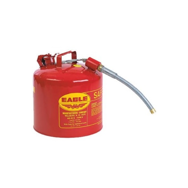 5 Gallon, Type ll, Galvanized Steel Safety Can With 1 OD, Flexible Metal Pour Spout, Double Opening, Seamless Drawn Dome Shaped Top With Double Lock Bottom Seam Which Serves As Heavy Duty Shock Rim, Brass Flame Arrestor Pour Spout, Meets OSHA Requirements, FM, UL Approved