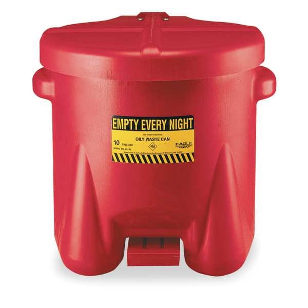 Oily Waste Can, Can Diameter 18 in, Capacity 10 gal, Can Material Polyethylene, Material Finish Not Applicable, Color Red, Height 18 in, Length 18 in, Lid Closure Type Foot Operated Self-Closing, For Location Floor, Product Type Oily Waste Can, Standards FM, NFPA, OSHA, Width 22 in