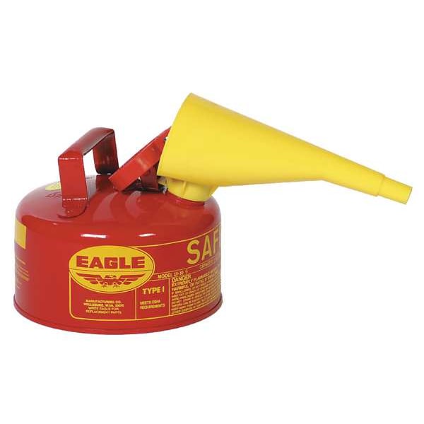 Type I Safety Can, Can Type Type I, DOT Approved Not DOT Approved, Capacity 1 gal, Compatible Fluids Flammables, Color Red, Can Material Steel, Material Finish Powder Coated, Hose Outside Diameter Not Applicable, Included Hose/Funnel Funnel, Can Diameter 9 in, Overall Height 8 in, Includes Faucet Faucet Not Included, Faucet Channel Diameter Not Applicable, Overall Width Not Applicable, Cap Features Self-Closing, Faucet Location Not Applicable, Footprint Shape Circle, Hose Length Not Applicable