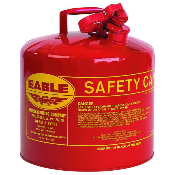 Type I Safety Can, Can Type Type I, DOT Approved Not DOT Approved, Capacity 5 gal, Compatible Fluids Flammables, Color Red, Can Material Steel, Material Finish Powder Coated, Hose Outside Diameter Not Applicable, Included Hose/Funnel Not Applicable, Can Diameter 12 1/2 in, Overall Height 13 1/2 in, Includes Faucet Faucet Not Included, Faucet Channel Diameter Not Applicable, Overall Width Not Applicable, Cap Features Self-Closing, Faucet Location Not Applicable, Footprint Shape Circle