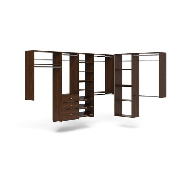 Looking for a storage solution designed just for you We've got your back. Easy Track's L-Shaped closet kit was made to be your easy-to-install, walk-in dream! The two-kit combination includes double-hanging for your best button ups, jackets, pants and more. Shelving is included to hold sweaters, jeans, and miscellaneous belongings. The shoe fence for easy access to footwear. And for some hidden storage, three drawers. With this kit, you'll be able to fill any space and get organization at your fingertips. Enjoy the durable, scratch-resistant laminate material and the rich Truffle finish. Ships in 9 cartons.