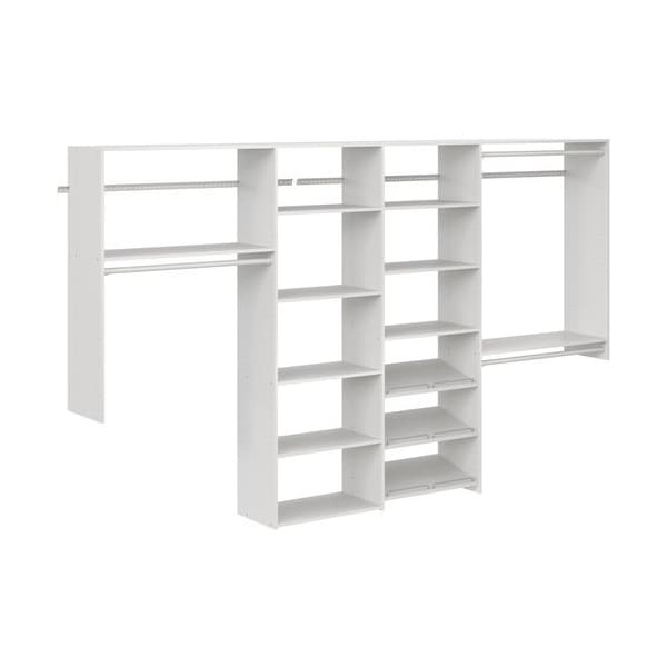 The Dual Tower 10-foot Classic Kit is easy installation and organization from beginning to end. This kit meets everyday organization needs with open and adjustable shelving, slanted shoe storage and ample hanging space. Utilize 24 feet of adjustable shelf space to stack sweaters, denim, bags, and more. The ample open shelving leaves room for personal touches and large bins to hold miscellaneous items. Keep favorite footwear off the floor and easy to select with six feet of slanted shoe shelving. And nine feet of hanging space offers quick access to shirts, dresses and slacks. Easy to install, the Dual Tower Classic closet organizer hangs on wall-mounted steel rails and comes with all of the required installation hardware.