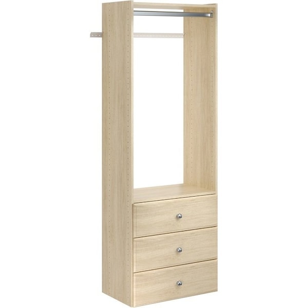 Easy Track Elite Tower wood closet organizer makes any closet more organized. Need hidden storage for folded items The durable three drawer dresser includes stylish fronts and knobs. Need hanging space for your medium length clothing The adjustable-height rod offers up to 24 inches. The contemporary gray woodgrain finish complements a wide range of decor styles. Ships in 2 cartons.