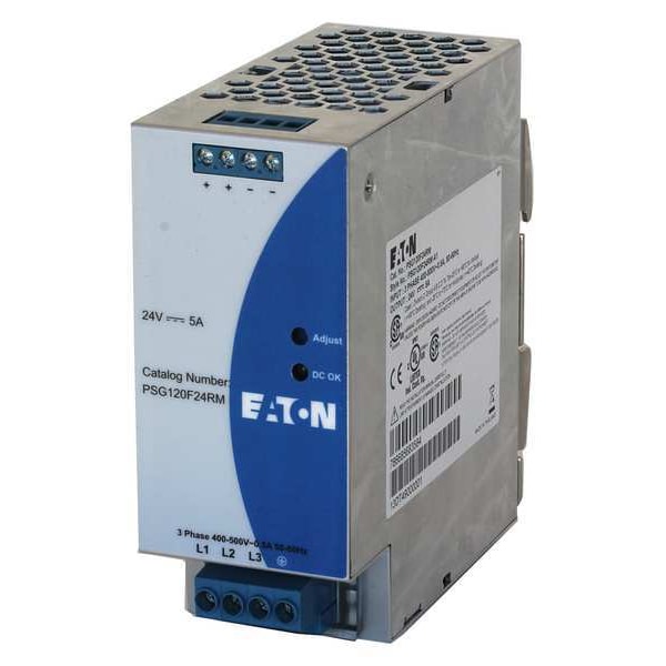 DC Power Supply, Input Voltage 400 to 500V AC, Output Voltage 24V DC, Power Rating 120W, Output Amps 5, Mounting DIN Rail, Switching, Case Material Aluminum Case, Height 4.61 in, Width 1.97 in, Depth 4.76 in, Series PSG, Hz 50 to 60 Hz, Phase - Electrical Three, Peak Amps 7.50, IP Rating IP20, Output Noise Less Than 50mV, Hold Up Time Greater Than 22 msec, Status Indicator LED/DC OK Signal, NEMA Rating 1