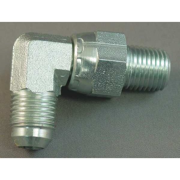 Hydraulic Hose Adapter, For Hose Type Hydraulic, Thread Size 3/8 In.-18, Fitting Shape 90 Degrees Elbow, Swivel, 4,000 psi, Includes O-Ring No, Crimpable No, Compatible Pipe Size 3/8 in, Hose Fitting A Gender Male, Hose Fitting B Gender Male, Hose Fitting A Size 3/8 in, Hose Fitting B Size 1/2 in, Hose Fitting A Connection Type NPTF, Hose Fitting B Connection Type JIC, Overall Length 1.8 in, Fitting Material Carbon Steel x Carbon Steel, 12L14, 12L15, SAE J514, J513, J512, J1926, J1453