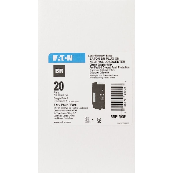 Type BR arc fault/ground fault circuit breaker. Plug on neutral design (no pigtail). Only for use with plug on neutral panels.