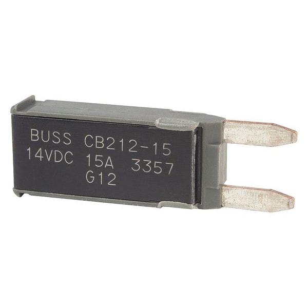 Automotive Circuit Breaker, Mount Type Plug In, Mount Style Surface, Current Rating 15 A, Voltage Rating 14V DC, Interrupt Rating 225 A at 14V DC, Terminal Connection Blade, Circuit Breaker Type Type II Footprint Circuit Breaker, Compatible Product Type ATM Fuse Footprint, Compatible Vehicle Type Boats, Buses, RVs, Trucks, Housing Material Thermoplastic/Metal, Overall Depth 1 1/2 in, Overall Height 1/4 in, Overall Width 1/2 in, Reset Type Modified, Series CB212