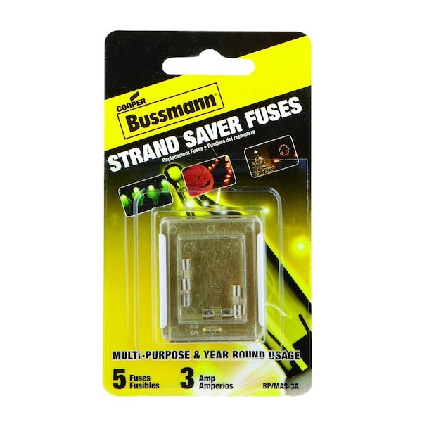 Amps: 3 Application: Year Round Holiday Light Brand Name: Bussmann CSA Listed: Yes Endcap Construction: Individual Product Diameter: Individual Product Length: Number in Package: 5 Packaging Type: Carded Product Type: Glass Tube Fuse Sub Bran