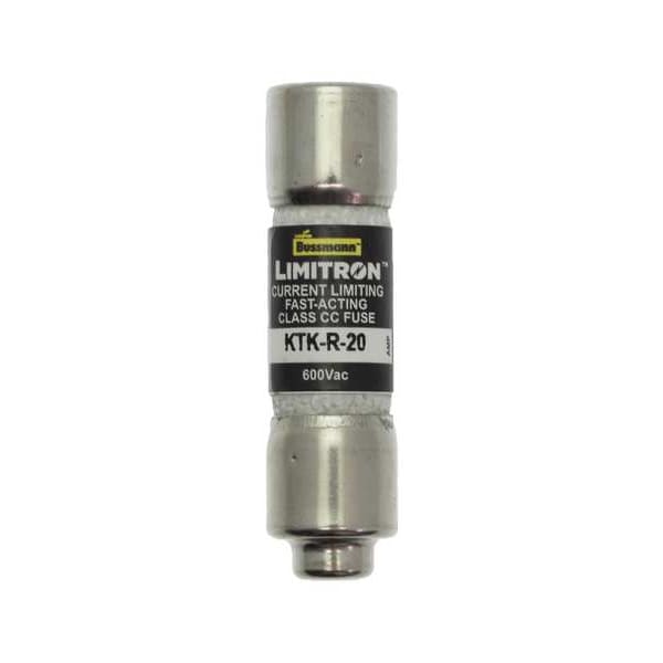 Fuse, 20 A, 600 V AC, Not Applicable, Class CC, KTK-R Series, Non-Indicating, Fast-Acting, Body Style Cylindrical, Fits Fuse Block Style Rejection, Interrupt Rating 200kA at 600V AC, Fuse Size 1-1/2 in L x 13/32 in dia, Length 1 1/2 in, Diameter 13/32 in, Equivalent Brand and Series Bussmann KTK-R, Littelfuse KLKR, Mersen ATMR, Equivalent Series ATMR, KLKR, KTK-R, Compatible Fuse Block Series BCM, BMM, CCP2-X-X-CC, CCP2-X-X-M, CHCC, CHM, HEB, HEX, HEY, HEZ, Body Material Melamine, Single Element