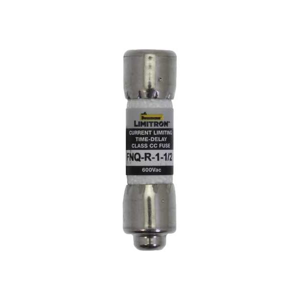 Fuse, 1 1/2 A, 600 V AC, Not Applicable, Class CC, FNQ-R Series, Non-Indicating, Time-Delay, Body Style Cylindrical, Fits Fuse Block Style Rejection, Interrupt Rating 200kA at 600V AC, Fuse Size 1-1/2 in L x 13/32 in dia, Length 1 1/2 in, Diameter 13/32 in, Equivalent Brand and Series Bussmann FNQ-R, Littelfuse KLDR, Mersen ATQR, Equivalent Series ATQR, FNQ-R, KLDR, Compatible Fuse Block Series BCM, BMM, CCP2-X-X-CC, CCP2-X-X-M, CHCC, CHM, HEB, HEX, HEY, HEZ, Body Material Melamine, Dual Element