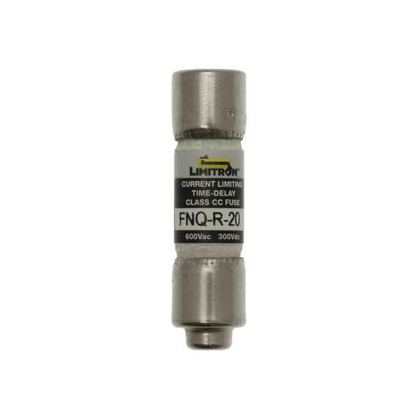 Fuse, 20 A, 600 V AC, 300 V DC, Class CC, FNQ-R Series, Non-Indicating, Time-Delay, Body Style Cylindrical, Fits Fuse Block Style Rejection, Interrupt Rating 200kA at 600V AC, 20kA at 300V DC, Fuse Size 1-1/2 in L x 13/32 in dia, Length 1 1/2 in, Diameter 13/32 in, Equivalent Brand and Series Bussmann FNQ-R, Littelfuse KLDR, Mersen ATQR, Equivalent Series ATQR, FNQ-R, KLDR, Compatible Fuse Block Series BCM, BMM, CCP2-X-X-CC, CCP2-X-X-M, CHCC, CHM, HEB, HEX, HEY, HEZ, Body Material Melamine